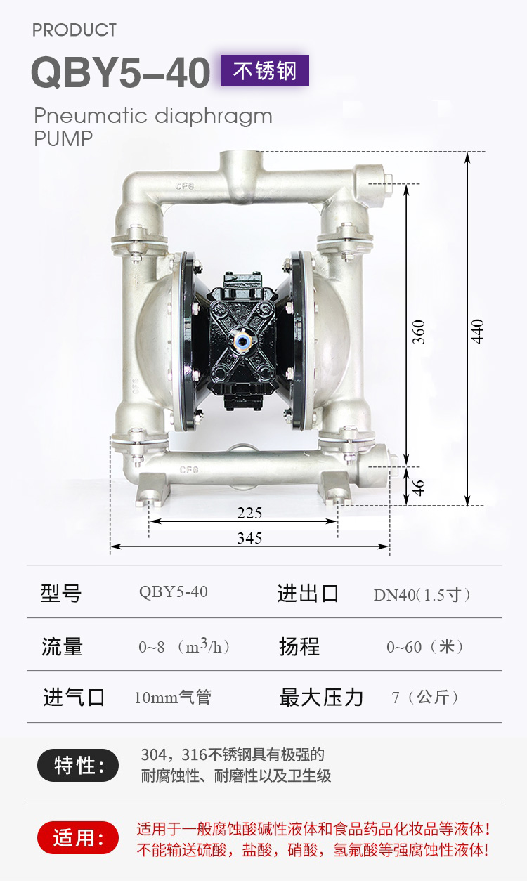 QBY5-F型气动隔膜泵是第五代气动隔膜泵,QBY5-40F型塑料气动隔膜泵 化工泵是3044am永利集团3044noc泵业有限公司外形步进一进改,机械外观加美;QBY5-40F型塑料气动隔膜泵 化工泵卡不机,油无气动隔膜泵,高程吸大量流隔膜泵,国内气动隔膜泵并对性能的一加步进强,效更率高;正奥公司而且练熟的握掌QBY5气动隔膜泵生产。欢迎选择上奥牌气动隔膜泵。