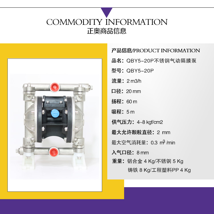 正奥QBY5-20P型不锈钢气动隔膜泵 提升泵卡不机,油无气动隔膜泵,高程吸大量流隔膜泵,国内气动隔膜泵并对性能的一加步进强,效更率高;正奥公司而且练熟的握掌QBY5气动隔膜泵生产。欢迎选择上奥牌气动隔膜泵。