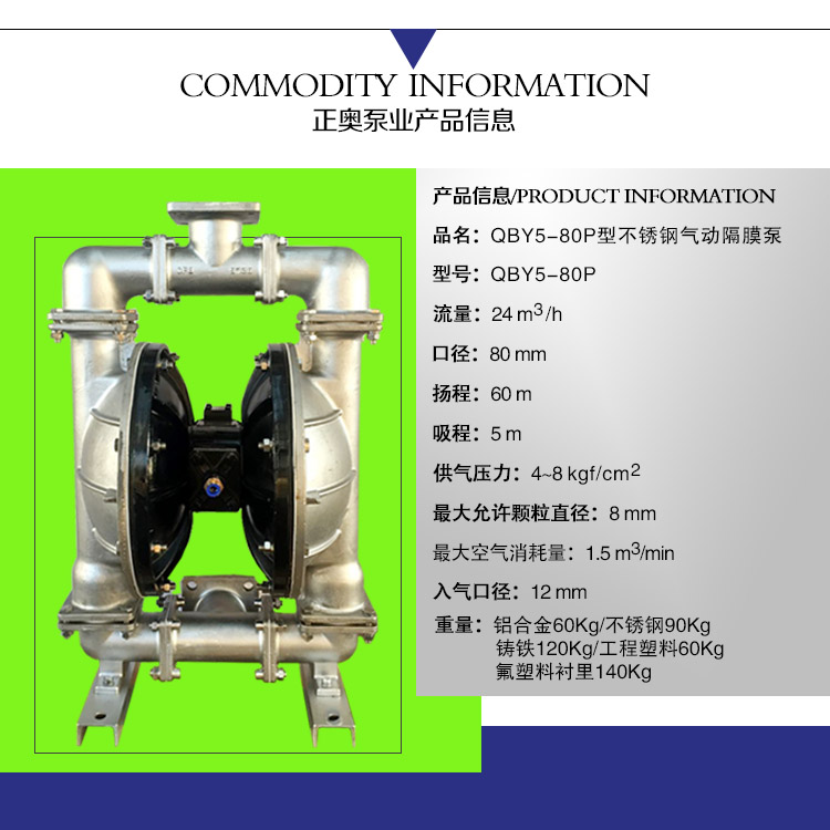 正奥QBY5-80P型不锈钢气动隔膜泵 不锈钢化工泵是第五代气动隔膜泵是3044am永利集团3044noc泵业有限公司外形步进一进改,机械外观加美;卡不机,油无气动隔膜泵,高程吸大量流隔膜泵,国内气动隔膜泵并对性能的一加步进强,效更率高;正奥QBY5-80P型不锈钢气动隔膜泵 化工泵正奥公司而且练熟的握掌QBY5气动隔膜泵生产。欢迎选择上奥牌气动隔膜泵。