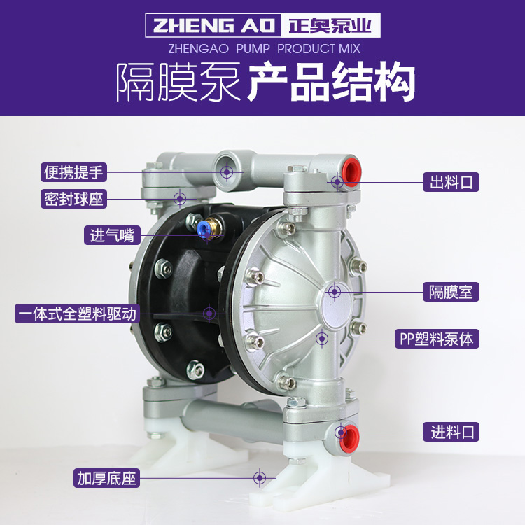 正奥气动隔膜泵气动化工泵正奥公司主导产品有:气动隔膜泵,塑料隔膜泵,不锈钢隔膜泵,隔膜泵型号,不锈钢磁力泵,氟塑料磁力泵,不锈钢水泵,不锈钢螺杆泵,单螺杆泵,电动油桶泵,管道离心泵,不锈钢离心泵,立式离心泵,卧式离心泵,不锈钢自吸泵,自吸排污泵,耐腐蚀泵,不锈钢化工泵,隔膜式计量泵,液压式计量泵,螺杆泵,齿轮油泵,耐腐蚀化工泵。
