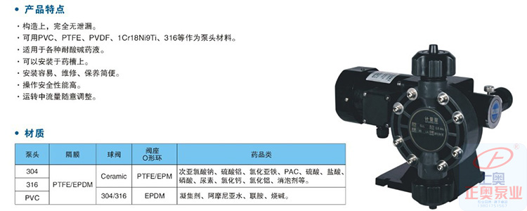 2. 可用PVC、PTFE、PVDF、1Cr18Ni9Ti、316等作为泵头材料。