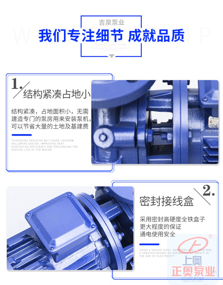 噪音低:两个低噪音轴承支撑下的水泵,运转平稳,除电机微弱声响,基本无噪音。
