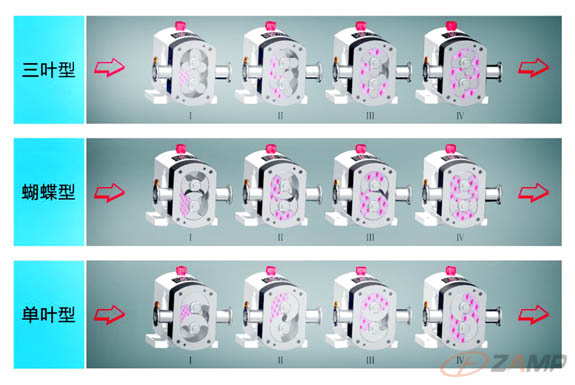 转子泵又称罗茨泵、胶体泵、高浓浆泵等,它依靠两个同步运动的转子,由一对外置式同步齿轮箱进行传动,转子在传动轴的带动下进行同步反方向旋转,从而构成了较高的真空度和排放压力。两转子将转子室分隔成几个小空间,并按I-II-III-IV的次序运转。运转到I位置时,只有进口处充满介质;运转到II位置时,II室中封闭了部分介质;到位置III时,III室中也封闭了介质;到位置IV时,进口处和出口室相通,介质即被输送至出物料管道。按这样的循环往复,介质即被不断的输送出去。