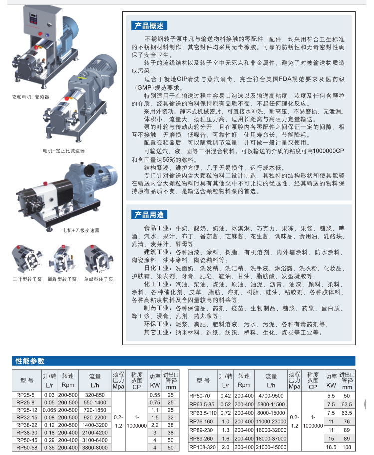 RP-120型不锈钢转子泵特别适用于输送中易产生泡沫以及高粘度、浓度及任何含颗粒的介质,经其输送的物料保持原有品质不变,无剪切,不起任何理化反应。如采用外装动、静环式机械密封,可直接水冲洗。转子泵耐高压,不易磨损,无泄漏。体积小,流量大,扬程压力高,适用长距离与高阻力定量输送。
