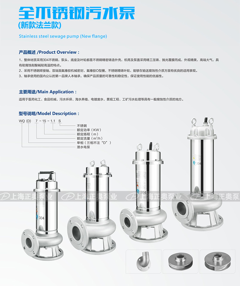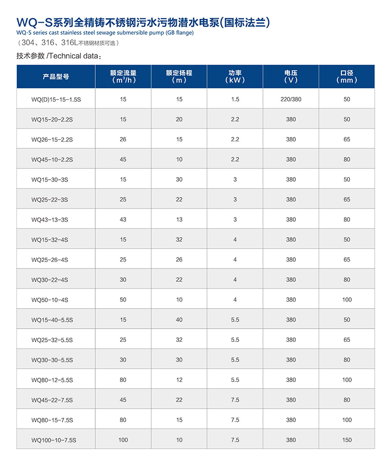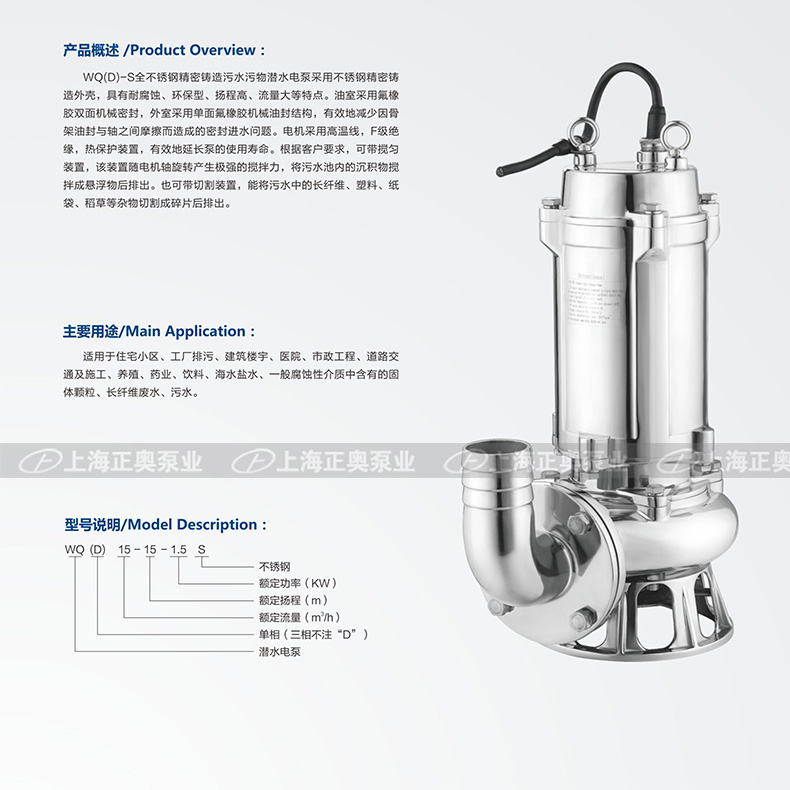 WQ(D)-S全不锈钢精密铸造污水污物潜水电泵采用不锈钢精密铸造外壳,具有耐腐蚀,环保型,扬程高,流量大等特点。油室采用氟橡胶双面机械密封,外室采用单面氟橡胶机械油封结构,有效地减少因骨架油封与轴之间摩擦而造成密封进水问题。电机采用高温线,F级绝缘,热保护装置,有效地延长泵的使用寿命。根据客户要求,可带搅匀装置,该装置随电机轴旋转产生的搅拌力,将污水池内的沉积物搅拌成悬浮物后排出,也可带切割装置,能将污水中的长纤维,塑料,纸袋,稻草等杂物切割成碎片后排出。