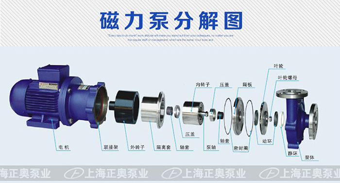 磁力泵以静密封取代动密封,使泵的过流部件处其他泵机械密封无法避免的跑、冒、滴之弊病。选用耐腐蚀、高强度的工程塑料、钢玉陶瓷、不锈钢等作为制造材料,因此它具有良好的抗腐蚀性能,并可以使被输送介质免受污染。