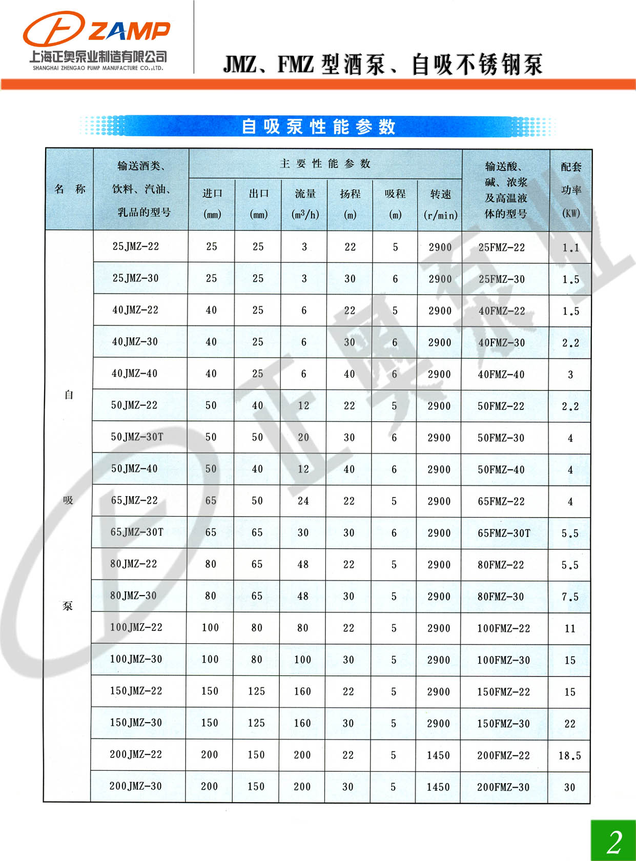 JMZ、FMZ自吸酒泵自吸化工泵性能范围:流量为3M3/h~190M3/h,扬程为22m~60m,口径为:25mm~150mm。