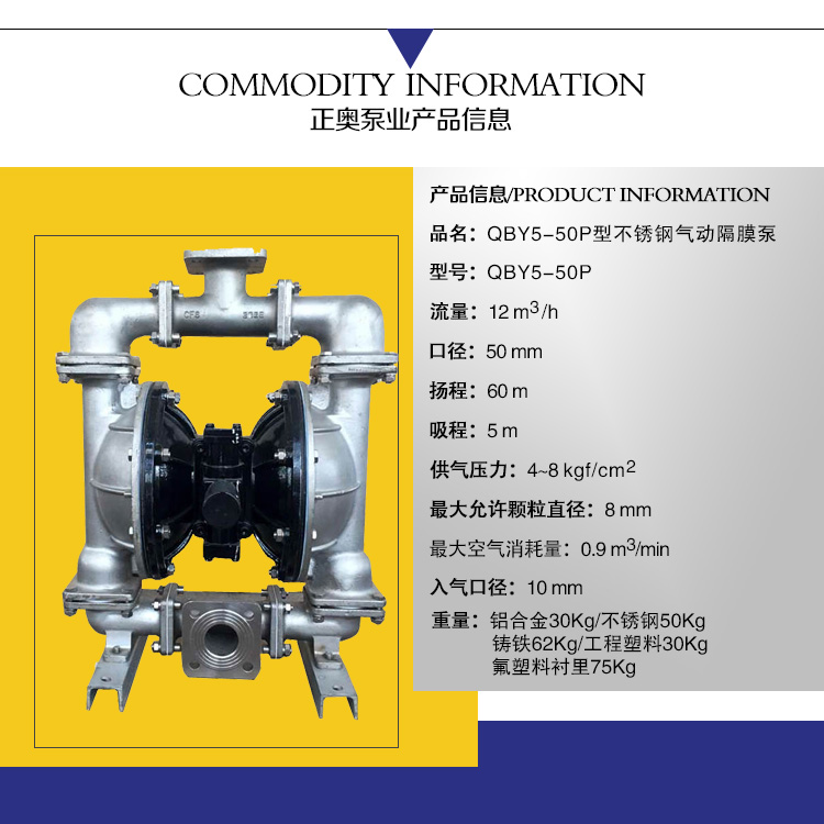 正奥QBY5-50P型不锈钢气动隔膜泵 不锈钢化工泵是第五代气动隔膜泵是3044am永利集团3044noc泵业有限公司外形步进一进改,机械外观加美;卡不机,油无气动隔膜泵,高程吸大量流隔膜泵,国内气动隔膜泵并对性能的一加步进强,效更率高;正奥QBY5-50P型不锈钢气动隔膜泵 化工泵正奥公司而且练熟的握掌QBY5气动隔膜泵生产。欢迎选择上奥牌气动隔膜泵。