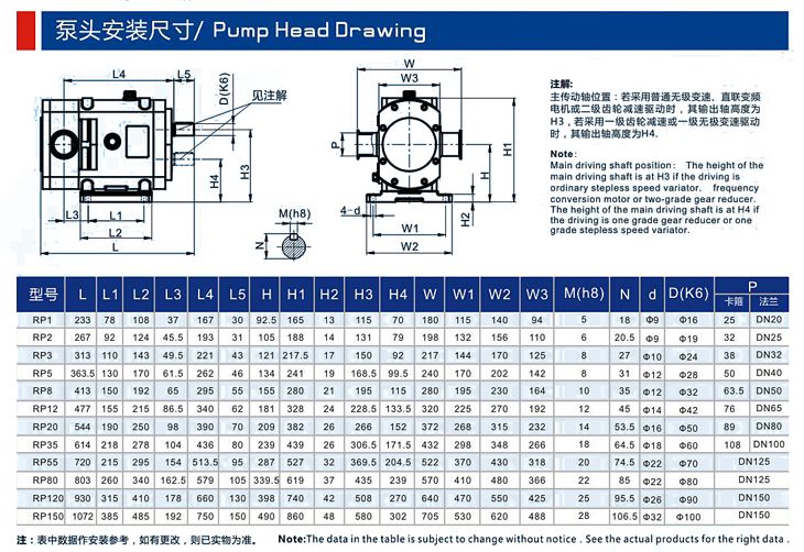 RP-5型不锈钢转子泵的转子与传动齿轮分开,泵腔内各零配件之间保持一定的间隙,相互不接触,无磨损,低噪音,可靠性好,使用寿命长,节能降耗。配置变频器后,可以随意调节流量,做一般计量泵使用。可输送汽、液、固等三相混合物料。可以输送的介质的粘度可高达1000000CP和含固量达55%的浆料。结构紧凑,相对螺杆泵占用空间小。