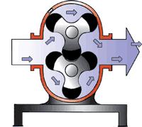 转子泵又称罗茨泵、胶体泵、高浓浆泵等,它依靠两个同步运动的转子,由一对外置式同步齿轮箱进行传动,转子在传动轴的带动下进行同步反方向旋转,从而构成了较高的真空度和排放压力。两转子将转子室分隔成几个小空间,并按I-II-III-IV的次序运转。运转到I位置时,只有进口处充满介质;运转到II位置时,II室中封闭了部分介质;到位置III时,III室中也封闭了介质;到位置IV时,进口处和出口室相通,介质即被输送至出物料管道。按这样的循环往复,介质即被不断的输送出去。