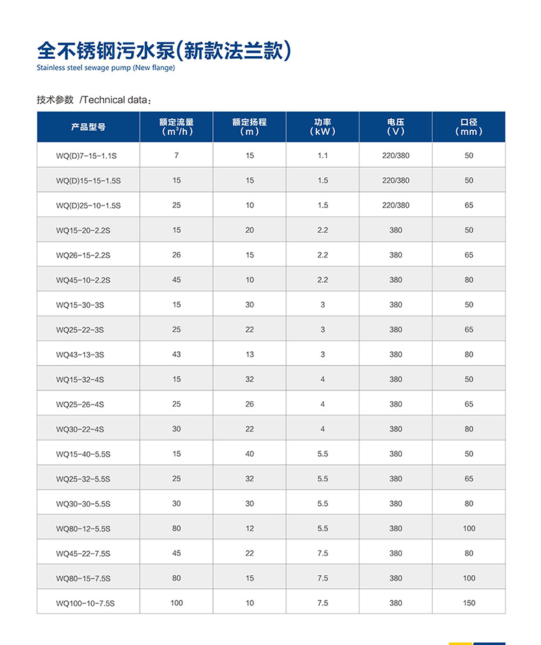 WQ(D)-S全不锈钢精密铸造污水污物潜水电泵采用不锈钢精密铸造外壳,具有耐腐蚀,环保型,扬程高,流量大等特点。油室采用氟橡胶双面机械密封,外室采用单面氟橡胶机械油封结构,有效地减少因骨架油封与轴之间摩擦而造成密封进水问题。电机采用高温线,F级绝缘,热保护装置,有效地延长泵的使用寿命。根据客户要求,可带搅匀装置,该装置随电机轴旋转产生的搅拌力,将污水池内的沉积物搅拌成悬浮物后排出,也可带切割装置,能将污水中的长纤维,塑料,纸袋,稻草等杂物切割成碎片后排出。